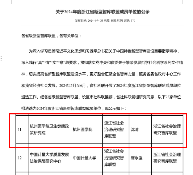 近日,浙江省社科联公布最新浙江省新型智库联盟成员单位遴选结果,经过层层筛选与严格评估,省社科联党组研究同意我校卫生健康政策研究院入选浙江省社会治理研究智库联盟成员单位。